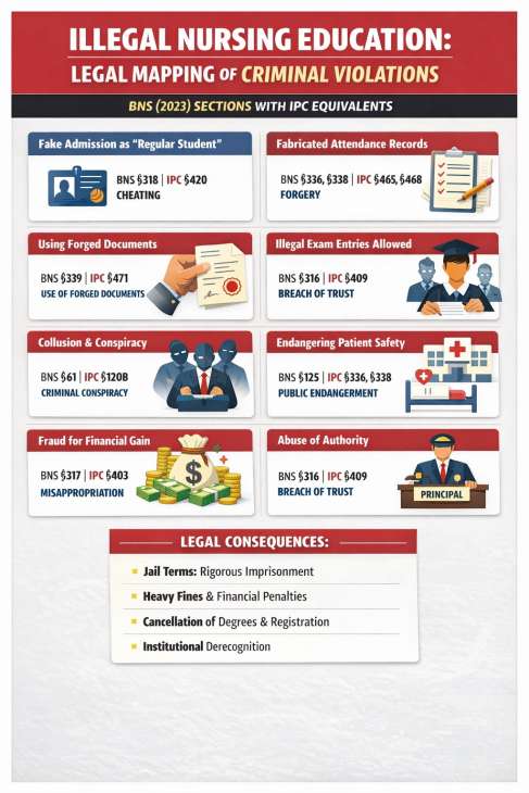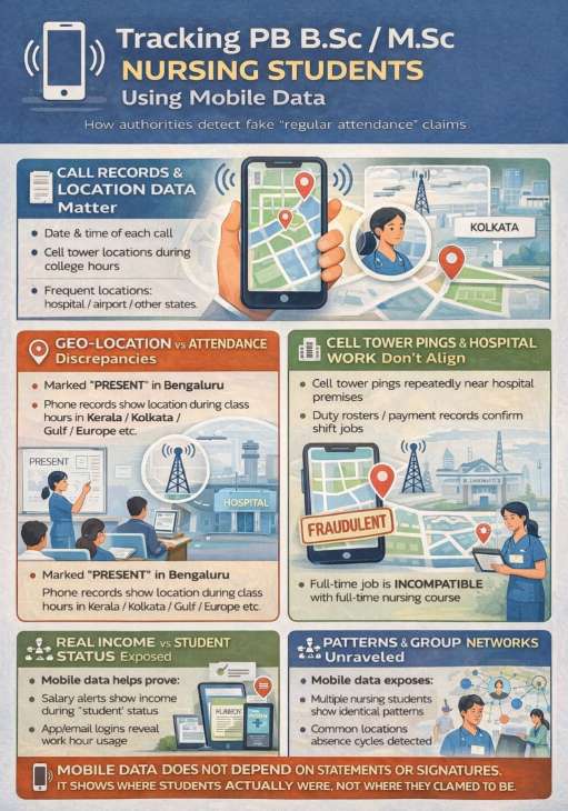 As per legal experts, there is no doubt that the principal of this nursing institution, Dr. R. Lakshmi Devi, who allegedly facilitated and produced fabricated and manipulated documents, will be arrested and sent to prison, along with the fake students.